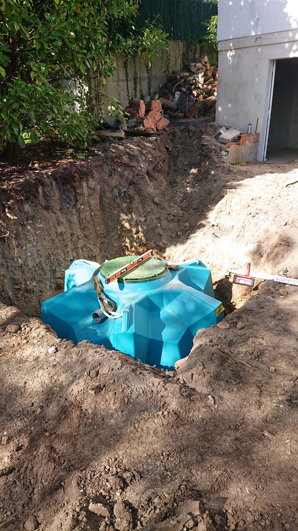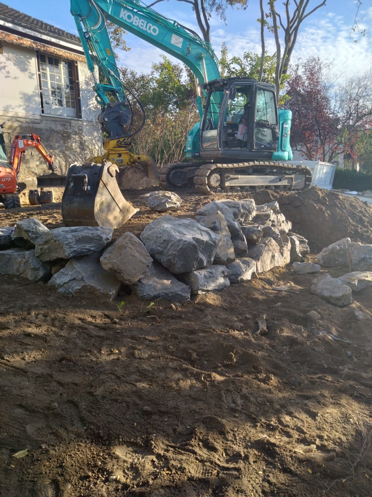 Dans un premier temps, nos équipes ont procédé à la coupe et à l’évacuation des végétations gênantes afin de dégager et sécuriser la zone d’intervention. Nous avons ensuite effectué un premier terrassement, avec mise à niveau du terrain et préparation du sol selon les contraintes du projet, puis terrassement de la fosse et pose de la cuve.Enfin, après étude et validation avec le client, nous avons assuré le choix et la pose de l’enrochement, garantissant à la fois stabilité du terrain, soutènement efficace et rendu esthétique durable.